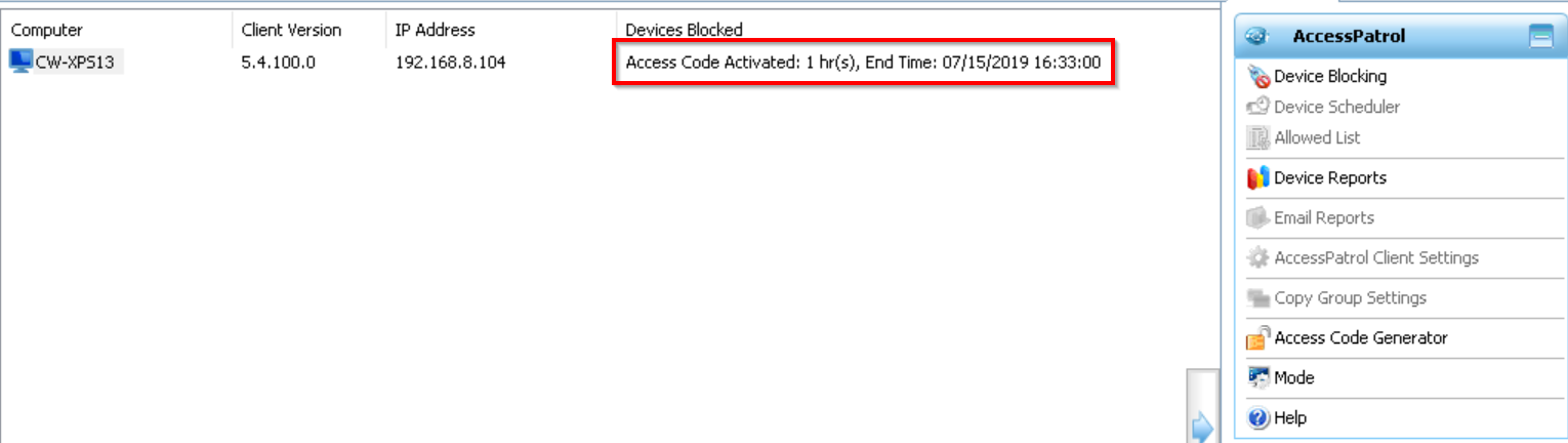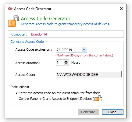 CurrentWare Konsolu'ndan yöneticiler, uç nokta erişimi sağlamak istedikleri çalışan (lar) ı seçebilir ve ardından USB'ler, harici sabit sürücüler ve WiFi bağdaştırıcıları gibi uç nokta cihazlarına erişmelerini sağlayan geçici bir erişim kodu oluşturabilir. Bir kez oluşturulduktan sonra erişim kodları anında işverenlere ve yöneticilere gerçek zamanlı yetenekler sağlayarak etkindir.