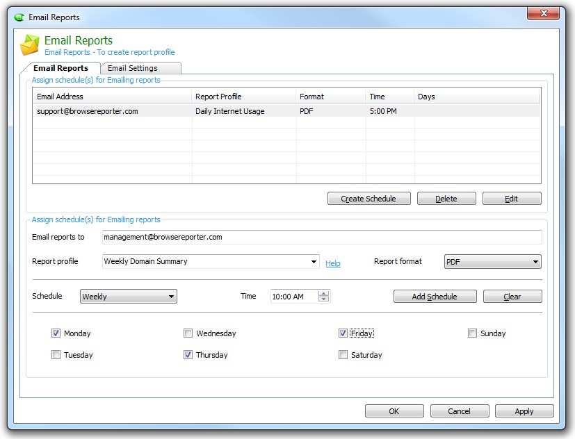 E-posta Raporları (Email Reports) özelliği sayesinde BrowseReporter raporları otomatik olarak oluşturulabilir ve yöneticiye e-postayla gönderilebilir. Bu, rapor oluşturma işlemine manuel olarak güvenmek zorunda kalmamızı engeller.