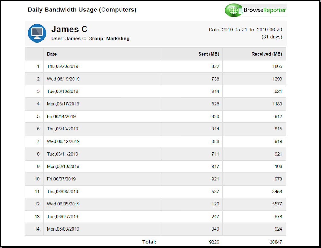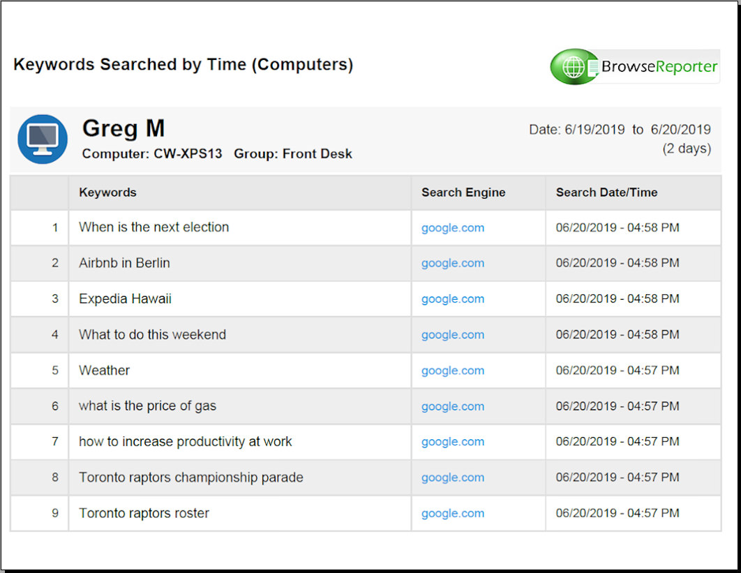 BrowseReporter, belirli bir kullanıcının İnternet etkinliğini izleyebilir . Bir çalışan veya öğrenci birden fazla bilgisayar kullanıyorsa, BrowseReporter bu kullanıcının göz atma etkinliğini ilgili tüm bilgisayarlarda izler.