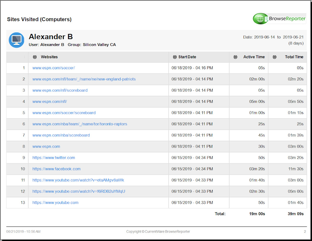 Ziyaret Edilen Sitelerin RaporuÇalışanlarınızın İnternet faaliyetlerini gözden geçirin. Ziyaret Edilen Siteler Raporu, ziyaret ettikleri her bir URL’yi ve ne kadar süreyle ziyaret ettiklerini içerir.