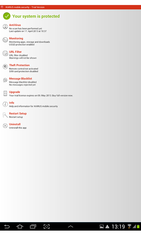 IKARUS mobil güvenlik ek güvenlik özellikleri ile ücretsiz olarak veya tam sürümde kullanılabilir. Bu hizmetler Google Play aracılığıyla uygulamayı güncellemeyi gerektirir.
